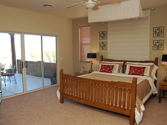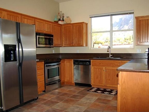 Stunning adobe construction at the foot of the Superstitions. View of mountains and city lights. Great room featuring open kitchen and dining below, second great room upstairs with two separate bedrooms, kitchen/wet bar, mother in law quarters or rumpus room with dual decks. Granite counters, custom cabinetry, $40,000 worth of landscaping includes stunning waterfall and circular drive with lighting. Misting system and hot tub on patio with ceiling fans.