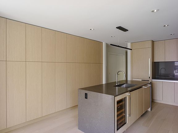 Private patio spaceHardwood flooringMotorized blindsWaterfall quartz island