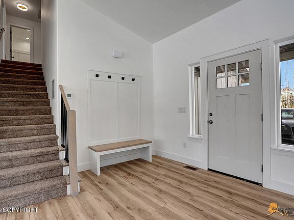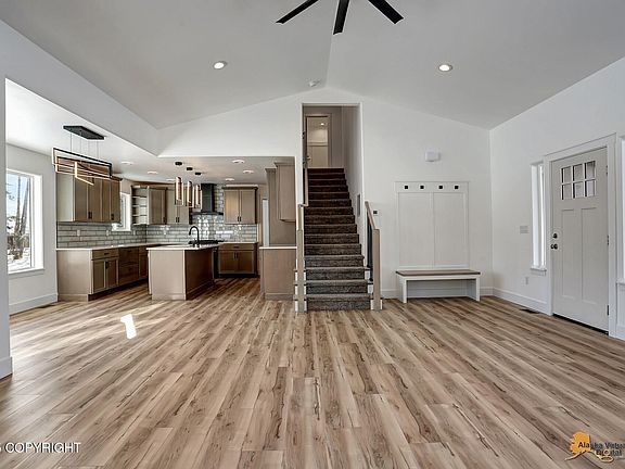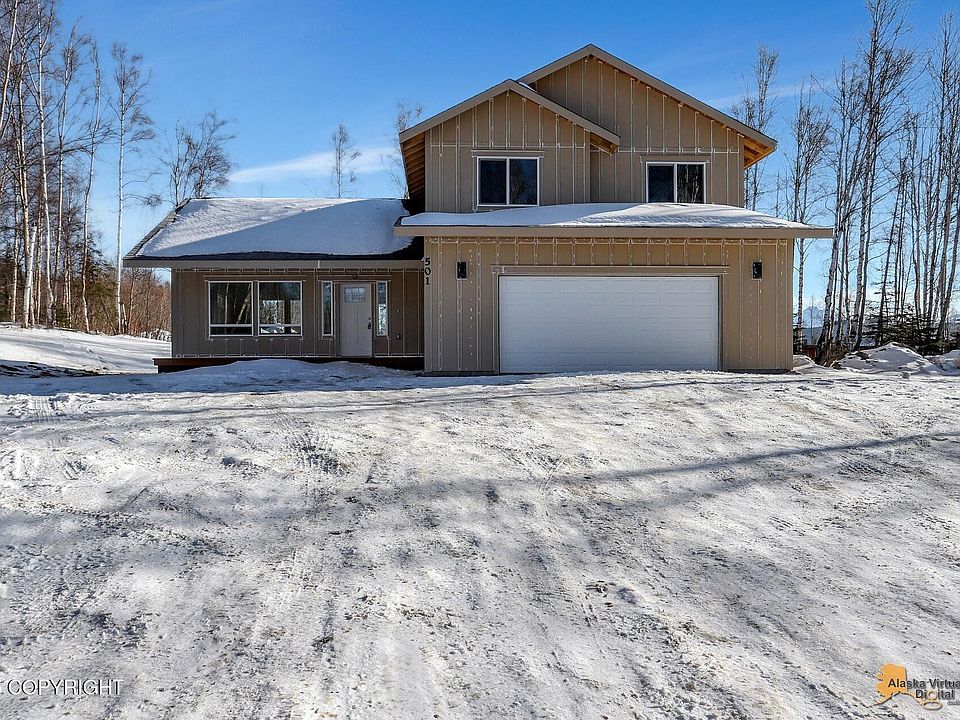 Beautiful 4-bedroom home just 7 minutes from downtown Wasilla--one of the few centrally located options on the market! This efficient layout offers versatility with a bedroom and full bathroom on the first floor, perfect as a convenient guest room or second master suite or a home office. Exterior features include board-and-batten siding, a covered entry porch, a covered back deck, and a paveddriveway for great curb appeal. Inside, you'll find painted maple cabinets (light gray color), a modern backsplash, quartz countertops, a custom coffered ceiling in the master bedroom, a tiled master shower/soaker tub, and durable LVP flooring throughout the first floor. There's still time to personalize your finishes, including exterior colors, tile, lighting, and countertops. Estimated completion: 90-120 days. Photos similar and may include upgrades not included in this home.