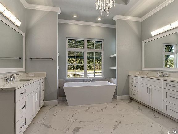 - Bathroom Features: Single Vanity, Walk-In Shower, Makeup/Vanity Space, Split Vanities, Window/Skylight in Bath, Rain Shower Head, Built-In Shower Bench, Water Closet/Priv Toilet, Multiple Shower Heads, Walk-In Tub