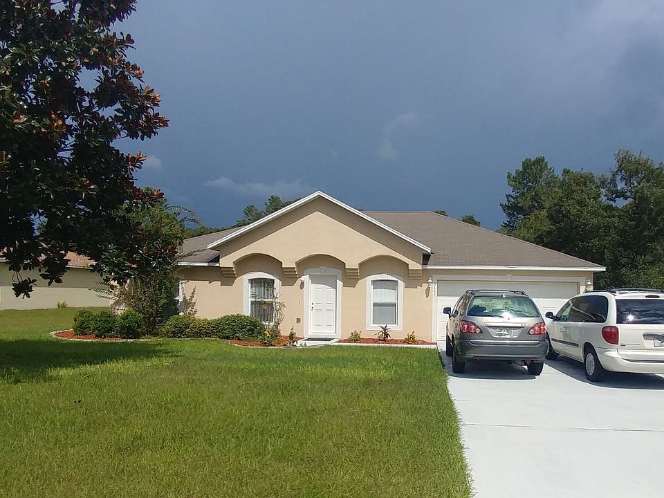 Nice quiet location in Marion Oaks north, near newer Marion Oaks Elementary with quick access to I-75 & shops on Hwy 484 & 200. The home was recently remodeled with new interior & exterior paint and new tile & laminate flooring. The open family room & kitchen, living, dining room and master bedroom have vaulted ceilings. There is also an RO drinking water filter system. The large screened & tiled lanai lead to a private backyard with wooded views. The driveway is long and flat. County water and private septic allow low water bills. Marion Oaks residents have access to a newer community center with fitness equipment, auditorium, organized activities for kids & adults. Onsite is also a park with walking trail, playground, lighted tennis & basketball sport courts. Nice amenities with no HOA
