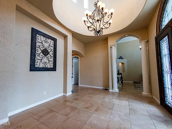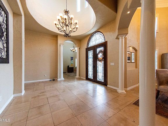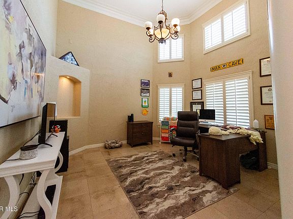 Experience elegance and comfort in this stunning Mediterranean-style home featuring a sparkling pool, a 4-car garage, and convenient RV parking. This spacious single-level residence offers 6 bedrooms, 3 full bathrooms, and 2 three-quarter bathrooms, plus a large theater room above the garage that can also serve as a bedroom, game room, office, or gym. From the moment you enter, the grand pillars, sky dome ceilings, and open layout create a breathtaking first impression. Throughout the home, you'll find travertine-marble flooring, wood shutters, and hand-textured walls, adding timeless sophistication. The gourmet kitchen is designed for both beauty and function, featuring granite countertops, a unique hexagon island, a wrap-around breakfast bar, and commercial-grade appliances. The kitchen seamlessly opens to a spacious family room with drop ceilings, a wet bar, and a view of the backyard oasis.The luxurious master suite includes a cozy fireplace and private patio access to the backyard. The mas