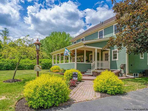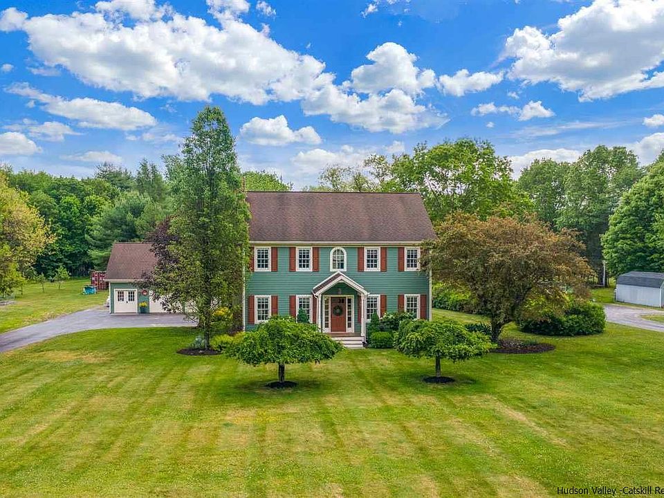Beautiful Center Colonial on a meticulously landscaped, picture perfect, 1.2 acres. This home was lovingly built and cared for by its current owners. The exterior of the home is triple primed & painted Dutch LAP siding. Inside glistening Australian Cypress hardwood floors run throughout. The living room is large with big windows framing wonderful views of the luscious front lawn. A gas fireplace sits center stage and creates a warm and inviting vibe. The kitchen is fully equipped with a Sub Zero refrigerator and a Thermador dual fuel stove, where the oven is electric and the cooktop is gas. It has a downdraft hood and is built right into an island which provides plenty of prepping space. There is an abundance of cabinets, a Bosch dishwasher and large pantry as well. The dining area is just off the kitchen and has plenty of room for entertaining a good number of guests. The wainscoting walls adds just the right amount if charm. If you would rather dine al fresco, there are french doors that lead you out to the extra large covered back porch which boasts douglas fir hardwood floors and a knotty pine ceiling. The main floor also holds a work-from-home office, a laundry/mudroom and a half bath. Upstairs is home to all 3 bedrooms. The primary bedroom has 2 walk-in closets and an en suite bathroom with shower and a 2 person Jacuzzi Whirlpool tub. One of the guest bedrooms has a small bonus room that could be a 2nd office space, extra storage/closet space, etc. A full bath is conveniently located between the 2 guest bedrooms. The detached two car garage has electric, radiant heat and it's own boiler. It has a workshop space and a staircase leading up to a large storage room. Outside, the property is beautifully landscaped with garden beds and an array of beautiful trees. In the summer months you can enjoy a swim in the above ground pool. All this is conveniently located close to the center of Stone Ridge, Kingston, Woodstock, hiking, swimming holes, shopping and much more!