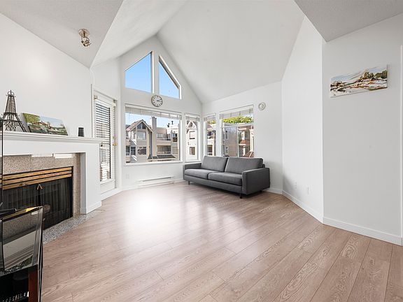Come view this spacious and bright 842 sqft 2 bed, 2 bath home on the quiet side of Collingwood! This gem offers added privacy and quiet living with no units above. Boasting 13' vaulted ceilings, large windows, a cozy gas fireplace, functional kitchen and an open living and dining area—perfect for entertaining! The primary bedroom features a walk-in closet and private ensuite. Well-maintained building with gym, sauna, and bike room. Only minutes to Joyce Station, Killarney Community Centre, Central Park, Metrotown, Crystal Mall, restaurants, and more! A perfect blend of comfort and convenience. 2 parking stalls & 1 locker included.