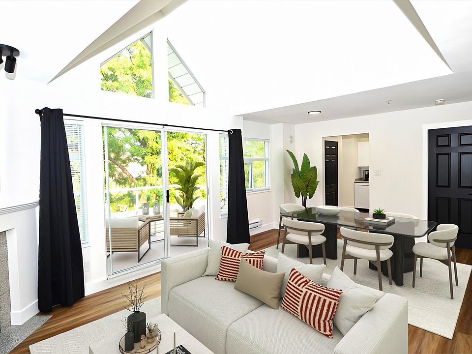 Corner unitOpen floor planVaulted ceilingExtra windowsNatural daylightTreed outlookVinyl plank flooring