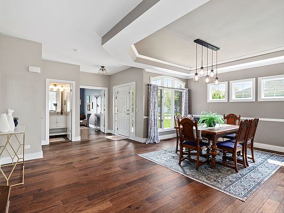 Unforeseen job relocation is taking sellers away from this exquisite home sooner than expected. Nestled in the sought-after Highland Woods neighborhood. Situated in a serene location, it offers captivating views of prairie land and a tranquil lake right across the street. The inviting front porch provides the perfect spot to unwind and soak in the surroundings. Step inside to discover a host of impressive updates, including newer light fixtures and flooring throughout the home. The main level showcases waterproof hickory engineered hardwood flooring, lending a touch of elegance and durability. The dining room features a tray ceiling and chair rail that add a stylish touch. A lovely stone dual sided fireplace, serves as a captivating focal point between the dining room and the family room. The family room itself boasts a vaulted ceiling adorned with skylights, creating an airy and bright ambiance. It seamlessly connects to the gourmet kitchen, a true culinary haven. Adorned with detailed cabinetry, gorgeous granite countertops, and stainless steel appliances (including an LG fridge with insta-view), this kitchen is a dream come true. It also offers a convenient breakfast bar with seating and a separate eating area with ample table space. Completing the main level is a private home office, a practical laundry room, and a stunningly remodeled powder room that is sure to impress. Retreat to the 2nd floor master suite, adorned with a tray ceiling and a spacious master bath featuring a vaulted ceiling, double sinks, a separate shower, and a relaxing soaking tub, creating a spa-like retreat. The second, third, and fourth bedrooms are generously sized, bathed in natural light, and share a tastefully appointed hall bath with dual vanities. Venture downstairs to the enormous FINISHED basement, offering even more living space to cater to your needs. A spacious family room beckons for entertaining, while an office area provides the perfect work from home space. Additionally, a gorgeous full bathroom adds convenience and style. This remarkable property includes an attached three-car garage. Step outside to the fenced-in backyard, featuring a beautiful brick paver patio where you can relax and enjoy the outdoors in privacy. This home sits just steps to the elementary school and many of the neighborhood amenities of Highland Woods including tennis, basketball, and volleyball courts, exercise facilities, a clubhouse, walking and biking trails, and multiple pools, including one with a thrilling waterslide. Conveniently located near major commuter routes such as 20, Randall, and I-90, this home offers easy access for commuting and exploring the surrounding area. With its impeccable updates, stunning features, and unbeatable location, this home truly has it all. Welcome to your dream home in Highland Woods-where comfort, luxury, and a vibrant community await you!
