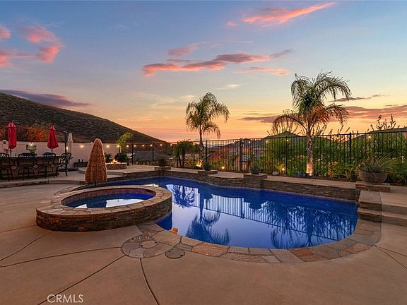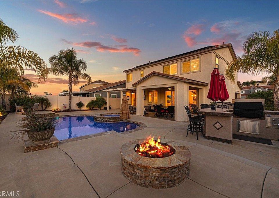 Situated at the end of a cul-de-sac, this immaculate home boasts magnificent curb appeal and shows just like a model. Pride of ownership radiates throughout every inch of this beautifully maintained residence. A decorative leaded-glass entry door welcomes you into a warm and inviting great room highlighted by a stylish shiplap accent wall. The gourmet chef’s kitchen is a true showpiece, featuring stainless steel appliances, a decorative backsplash, an ample center island with sink and counter seating, elegant pendant lighting, and a large walk-in pantry. Conveniently located on the main floor is a full downstairs bedroom, ideal for guests, multigenerational living, or a private home office. A beautifully remodeled downstairs bathroom adds even more functionality. A majestic stairwell with upgraded banister leads to the open second floor, which includes two additional bedrooms and a spacious den that can easily serve as a fifth bedroom. The oversized upstairs laundry room offers abundant cabinetry and plenty of space to handle even the most overdue loads. The generous master suite impresses with a decorative shiplap accent wall, crown molding, and beautiful views of the local hills. The luxurious master bathroom features a walk-in shower, separate soaking tub, and dual walk-in closets. Additional interior highlights include elegant tile flooring, engineered wood floors, window shutters, and ceiling fans throughout. Step outside and access your entertainer’s dream backyard through the upgraded 12-foot slider in the kitchen or the second slider in the dining area. This outdoor space has it all a sparkling pebble-tech pool and spa, built-in barbecue island with counter seating, fire pit, a California room, and an elegant alumawood patio cover complete with recessed lighting and ceiling fans. It’s the perfect setting to relax, host, and enjoy the best of Southern California living. Be the envy of all your friends and make this marvelous house your next home!