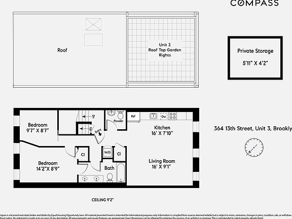 Perched on the top floor, just two flights up, this sunlit 2 bedroom/1.5bath penthouse is perfect in every way. Designed by LQ Designs, this home features an understated elegance with high ceilings, white oak flooring, an open kitchen with high end finishes including Milan Latte custom kitchen solid wood cabinetry, Carrera marble countertops, and Bosch and GE appliances. The luxurious bathrooms are appointed with Kohler purist fittings, floating vanities, a double sink in the full bathroom, and a blend of polished Carrera marble and Bardiglio and Thassos mosaic and porcelain tiles. Other creature comforts include central heating and cooling, in-unit washer/dryer, recessed lighting and private storage room. Completing this package is the opportunity to create a rooftop deck as this is the only unit that has the exclusive rights to a portion of the roof.* 364 13th Street is located between 6th and 7th Ave and close to the best shopping and dining in Park Slope including Union Market, Winner, Lively, Fonda and so much more. Transit is plentiful with access to R, F, G subway lines and B67/B63 bus lines. Presently zoned for PS 10/district 15. A truly special home awaits in Park Slope! **364 13th Street: this is not an offering, The complete offering terms are in an offering plan available from the File No. CD20-0084 *Sponsor is not making any representation to the use/buildout of roof.
