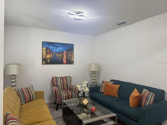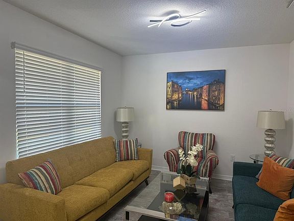 Come see this spacious 6 bedroom, 3 bath home with upgraded countertops, tile throughout, a flex room by the foyer, and 5 Bedrooms on the second floor and another one in the first floor given you plenty of room under one roof. This home also has an owners suite with his and hers walk in closets. The house is built with block over block construction and is also wired to be a smart home. The home features a beautiful open kitchen with stainless steel appliances and an island great for entertainment. The back yard is fenced and is ideal for your privacy and security and also great use if you have pets. The home is also located near grocery stores and is just minutes away from I4, restaurants, schools, Disney and much more. Enjoy in the beautiful community pool.