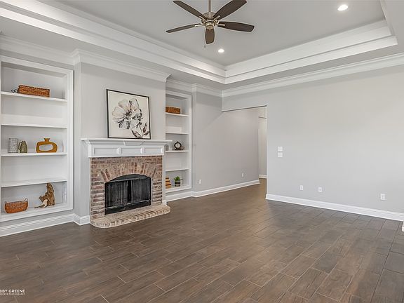 Lovely 3-bedroom, 2-bathroom home in Tuscany Villas. Spacious open floorplan with abundant natural light throughout. Wood-look tile flooring throughout the main living spaces offers character and easy maintenance. The living room feels open and airy with large, cased windows and a high trey ceiling with LED light feature. The brick fireplace and built-ins showcase the attention to detail. Flowing seamlessly from the living space, the kitchen will make meal prep a breeze with its large center island and stainless-steel appliances. The primary suite offers space to relax with its ensuite bath featuring a jetted soaking tub and separate tiled shower. The additional two bedrooms share a modern full bath giving privacy and convenience to guests and family alike. Outside, the covered back patio boasts plenty of space to host gatherings or to spend some quiet time outdoors. Conveniently located near I20 for easy travel around NWLA! Schedule your private tour today!