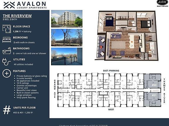 Welcome to the Avalon on Grand, where luxury meets convenience. Ark Built's newest offering in Chatham, a river view two-bedroom apartment, with the best views in the entire building. Boasting an impressive 10 ft ceiling, this unit offers an airy and open ambiance that is not found in other buildings. The modern kitchen is a chef's dream, featuring granite countertops and quality appliances that make cooking a pleasure. Step into the large bedrooms and discover walk-in closets, large windows and en-suite bathrooms. The private balcony, with glass panel railing, provides an exclusive outdoor retreat perfect for morning coffees or quiet evenings in the summer. Complete with in-unit laundry with front-load washer and dryer. Best of all, all utilities are included in the price, ensuring a hassle-free living experience. The Avalon on Grand redefines apartment living, offering unparalleled luxury and convenience. Nova Vida Cafe and bakery on the main level, with interior access for tenants. Gate controlled tenant-only parking. The "Riverview" model features the largest balcony - approx. 8 x 16ft - Last available Riverview model