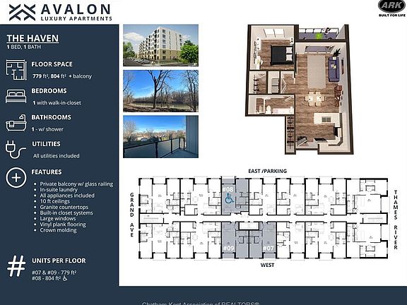 Welcome to the Avalon on Grand, where luxury meets convenience. Ark Built's newest offering in Chatham, a spacious one-bedroom apartment, that is designed with your comfort and lifestyle in mind. Boasting an impressive 10 ft ceiling, this unit offers an airy and open ambiance that is not found in other buildings. The modern kitchen is a chef's dream, featuring granite countertops and quality appliances that make cooking a pleasure. Step into the large bedroom and discover a walk-in closet and an expansive window that bathes the space in natural light. The private balcony, with glass panel railing, provides an exclusive outdoor retreat perfect for morning coffees or quiet evenings in the summer. The apartment is complete with a 3 pc bathroom and in-unit laundry with front-load washer and dryer. Best of all, all utilities are included in the price, ensuring a hassle-free living experience. The Avalon on Grand redefines apartment living, offering unparalleled luxury and convenience. 12 Month lease on approved credit and background check
