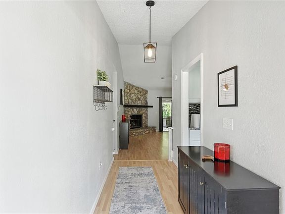 Stone fireplaceGranite countersLush greeneryOpen floor planVaulted ceilingsRare privacySplit bedroom design