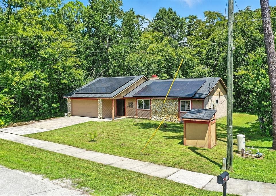 Welcome to this charming 3-bedroom, 2-bath home tucked away at the end of a quiet dead-end street in Longwood. Surrounded by a treed conservation area with no backyard or side neighbors, this retreat offers rare privacy while staying close to Lake Mary Blvd shopping, the YMCA, and top-rated Seminole County schools. Inside, the open floor plan with vaulted ceilings makes the 1,400 sq. ft. layout feel spacious and inviting. A stone fireplace anchors the Great Room, while the updated kitchen features granite counters, stainless appliances, and crisp white cabinetry. The split bedroom design includes a private primary suite with double vanities and two additional bedrooms. Enjoy mornings on the brick-paved screened patio overlooking lush greenery. Recent upgrades include a newer roof (2020) and all NEW windows installed in 2025. Complete with a 2-car garage and eco-friendly solar panels, this home blends modern comfort with peaceful living. Don’t miss this Longwood gem!