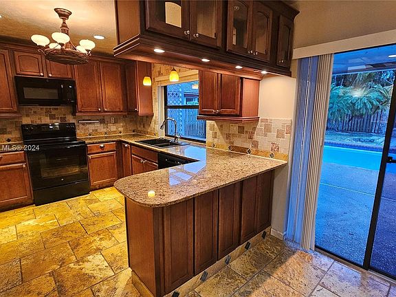 Magnificent 4 bedroom and 2 bathroom Coral Springs pool home! Open and updated country style kitchen features custom wood cabinets, granite counters and newer appliances. Custom made breakfast seating area. Over sized kitchen pantry and laundry room. Large family room and dining area contain high vaulted ceilings with decorative faux wood beam moldings. Gorgeous slate stone tile floors add to the home's unique country feel. Master bedroom suite with 2 separate walk-in closets and sliding glass doors which lead out onto the home's pool deck. Covered terrace over sees the home's inviting swimming pool. Situated on a wonderful spacious lot that has space left over for fruit trees or a kids play area. Centrally located inside an awesome tree lined quite neighborhood.