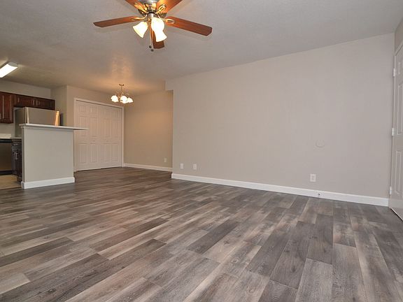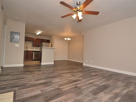 Open floor plan with spacious living room, separate dining space, and large kitchen with hardwood cabinetry, solid counters, and center island! Luxury vinyl plank flooring in main living space and bedroom! Inside utility with washer/dryer included! Plenty of storage with two coat closets in the living room and walk-in closet in the bedroom! Covered front patio with outdoor storage closet for your tools and toys!