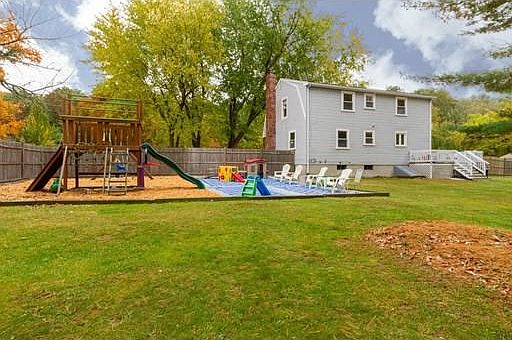 Fantastic center entrance Gambrel colonial with four bedrooms and three full bathrooms on a large fenced acre lot. First floor features an open and bright kitchen that flows into the dining room. On the other side of the house you will find a cozy fireplaced living room and a guest bedroom that would make a great den along with a full bathroom. Right off the kitchen is the side entrance directly onto an elevated deck overlooking the park like setting, which includes a shed and spacious play area. The second floor features three additional bedrooms and an en suite bathroom plus a secondary bathroom. You will find hardwood floors throughout with some great finishes including crown moldings. The basement is wide open and primarily used as storage. This home is very conveniently located close to shopping, major highways and move in ready.