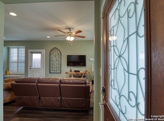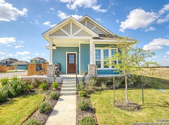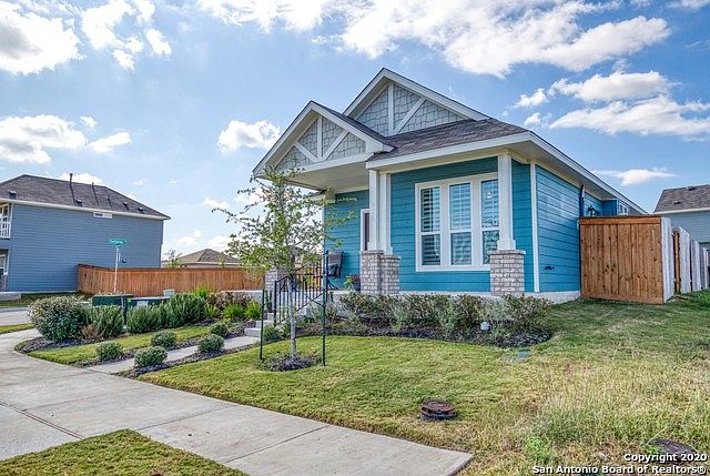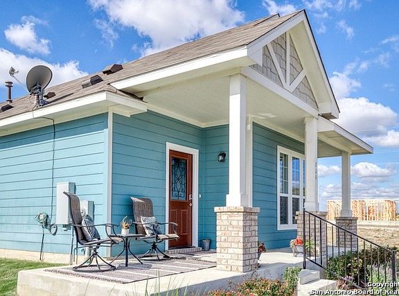 Beautiful one-story 2 bedroom/2 bathroom Pacesetter home offering an open floor plan. PUT ON MUST SEE LIST! Nestled in between New Braunfels and San Marcos and centrally located to both San Antonio & Austin! Professionally landscaped with front sitting porch creates an inviting curb appeal. Home is loaded with upgrades including wood floors, upgraded tile in bathrooms and kitchen backsplash, kitchen sink, Moen kitchen and bath fixtures, and elongated master shower. Kitchen features island, gas range and built in microwave. Master Bedroom has a large walk-in closet. Three month old water softener & sprinkler system complete this home. All one level. Enjoy community amenities-pool, sports court, sand volleyball, parks, playgrounds & more!