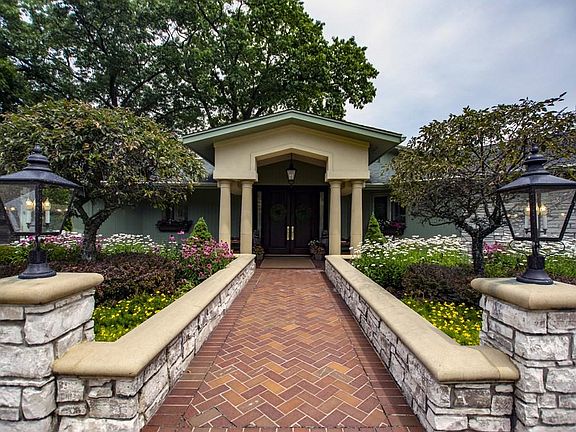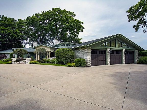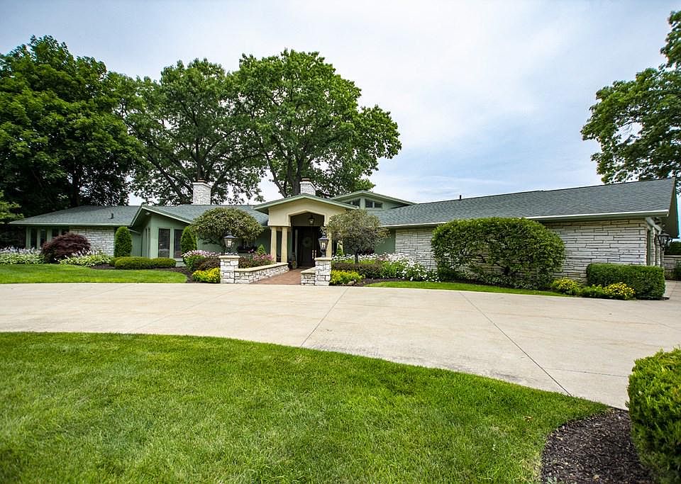 This elegant five-bedroom, four and one half bath, 5,380-square-foot home on about an acre in a quiet neighborhood comes with breathtaking panoramic views of the St. Joseph River, and custom woodwork and flooring, built-in cabinetry and stone counters, and beautiful landscaping. Stone walls and a brick paver path lead from the circular driveway to a columned entrance and soaring tiled foyer. The main level includes a kitchen with stainless appliances and eating area; dining room-living room with fireplace, vaulted ceiling with exposed beam, and windows on three sides; a study with fireplace and bar; a master bedroom with a fireplace and patio access, master bath with separate tub and shower and twin vanities; three other bedrooms; two other baths; a laundry room; and a storage area. The lower level has a large living area with fireplace; full bar with four bar stools, cabinets, an ice maker, and a refrigerator; and a suite with bedroom, bath, seating area, and private entrance. A series of patios in brick paver or cement leads from the house to the 175-foot waterfront with seawall and twin cantilevered steel-beam docks. The property comes with a three-and-a-half-car attached garage. The river is home to boating, fishing, and wildlife, including 40 white swans.