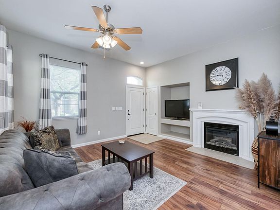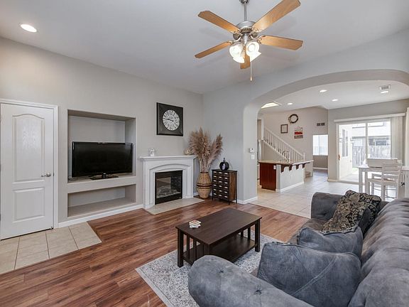 Welcome to life at Harlan Ranch, a sought-after community offering a clubhouse, pool, walking trails, and parks with open green space and playgrounds. Residents here also enjoy year-round community events from movie nights and live music to food trucks and art and craft fairs creating a vibrant and welcoming atmosphere.The primary suite is conveniently located on the main floor and opens through a sliding door to its own small patio, the perfect spot to start or end your day. A second downstairs bedroom provides flexibility for a guest room or home office. Throughout the main living areas, soaring 10-foot ceilings create a bright, open feel. The kitchen shines with rich cherry wood cabinets, granite countertops, and stainless steel appliances, flowing easily into the dining and living spaces.Upstairs you'll find two additional bedrooms freshly painted along with a full bath. Outside, the backyard is designed for low-maintenance enjoyment with an extended patio and synthetic grass. An attached two-car garage completes the package.Move right in and enjoy all that Harlan Ranch living has to offer!
