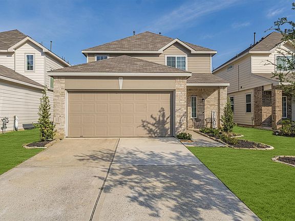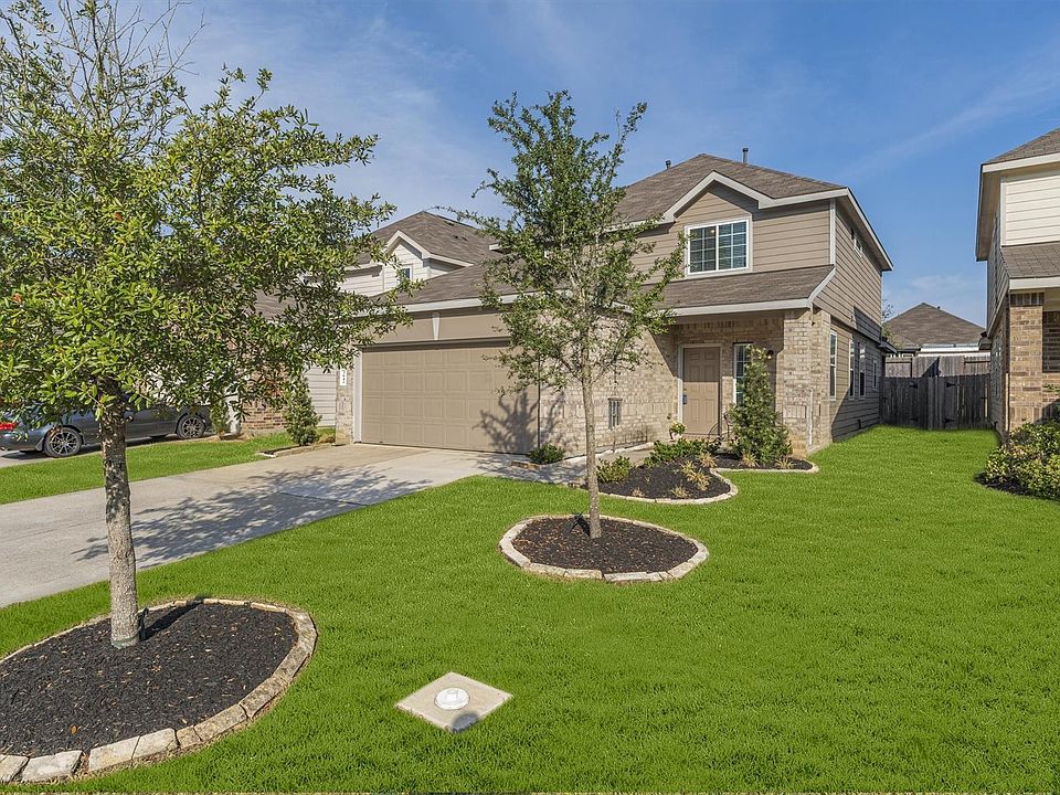 Welcome Home! This beautiful 4-bedroom, 2.5-bathroom open-concept home in Mackenzie Creek offers comfort, style, and convenience—just minutes from I-45, restaurants, and shopping. The spacious kitchen features a gas stove, island, and breakfast bar, perfect for cooking and entertaining. The primary suite, located downstairs, boasts a walk-in closet and ensuite bathroom with a soaking tub, separate shower and a double vanity. Upstairs, you’ll find an oversized game room surrounded by three generously sized secondary bedrooms—ideal for family or guests. Step outside to your Texas-sized covered patio and enjoy the large backyard, perfect for gatherings, relaxation, and outdoor fun. This home truly has it all—space, location, and charm!