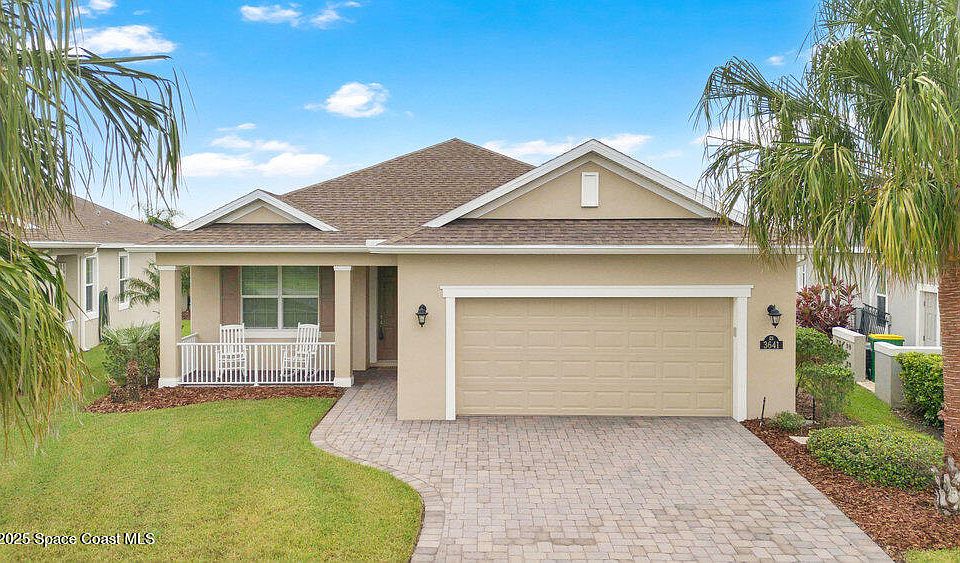 Wow. Don't miss out on this lovely block home in Trasona West. The popular Hallandale model offers an open floor plan with 3 bedrooms 2 baths, split bedrooms, spacious laundry room plus a bonus flex room with glass doors perfect for a home office/ study or 4th bedroom. This model also features a deeper than average garage with extra room for all of your toys. Recent updates/upgrades by the current owner include custom closets in the primary and 2nd bedroom, an expansive 34'x18' screen patio with brick pavers, professional painting of the inside and outside, luxury plank flooring in the study/office and upgraded carpeting in the primary owners suite. The beautiful kitchen, which is great for entertaining, offers a large breakfast bar, walk-in pantry and natural gas range. You will love the on-demand natural gas tankless water heater. Along with the full kitchen appliance package the front loading washer and dryer are included. The home is located on a quiet cul-de-sac lot that still has plenty of room in the backyard for outdoor activities or pool addition. The driveway is one of the longest in the neighborhood, perfect for hosting multiple guests. Community amenities include bike paths/walkways, pickleball courts as well as a clubhouse and 2 swimming pools. The HOA maintains your lawn, sprinklers and landscaping. Your new home is zoned for all the Viera A-Rated public schools. The location is fantastic as you are just minutes to The Avenue's shopping, Duran Golf Course, I-95 and Costco. Call today. This won't last long!