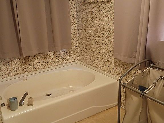 Master bedroom on one (with fully bathroom that includes shower and tub) and the other two bedrooms on the other side of the mobile home and share a large full bathroom.