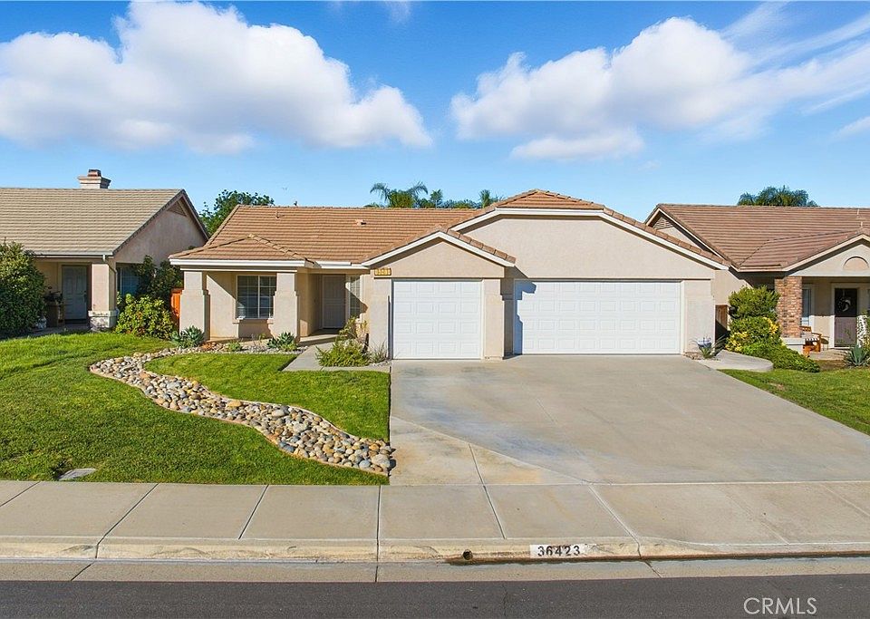 Single Level French Valley Charmer that is Move in Ready! The covered front porch entry leads you to this 1491 Sq. ft home w/ 3 Bedrooms; 2 on one side & the primary bedroom on the other side, plus 2 full baths. Tile flooring (carpeting in the bedrooms), tall ceilings, crown molding & ceiling fans all throughout the property. The kitchen has granite countertops, a center island, bar top seating, stainless appliances, pantry & a cozy dining space. The tall windows & Lg Slider in the living room allow you to have a great view of the backyard + there is a gas fireplace to enjoy on those chilly days. The primary bedroom suite has dual sinks in the bathroom, soaking tub & separate shower + walk in closet. The indoor laundry room leads out to the very roomy 3 car garage w/ space for 2 cars & all your other storage needs. The backyard has a loads of shade w/ an expansive covered patio cover + loads of grassy space + a built in fire pit. Plenty of room for a pool or kids play space! This home is perfect for someone looking for a first home with a yard or someone looking to downsize. Close to all the new development happening in Winchester or just minutes away from all Temecula has to offer. Low taxes and very low HOA. Come see this one ASAP!