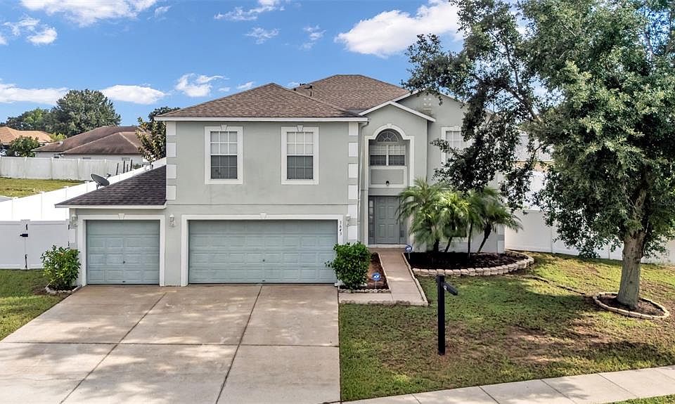 Welcome to Wellington View! This spacious 4-bedroom home offers 2 full bathrooms and 1 half bathroom with a 3 car garage, and over 2,800 square feet of living space, perfect for comfortable family living and entertaining. Inside you'll enjoy an open layout with generous room sizes, multiple living areas, and natural light throughout. The kitchen features ample cabinetry and a kitchen island with an additional sink, which flows into the dining and living spaces. Upstairs, you'll find all four bedrooms, including a large primary suite with walk-in closet and en-suite bath. Enjoy outdoor gatherings on the covered lanai overlooking the fenced backyard.