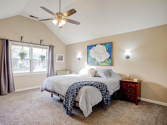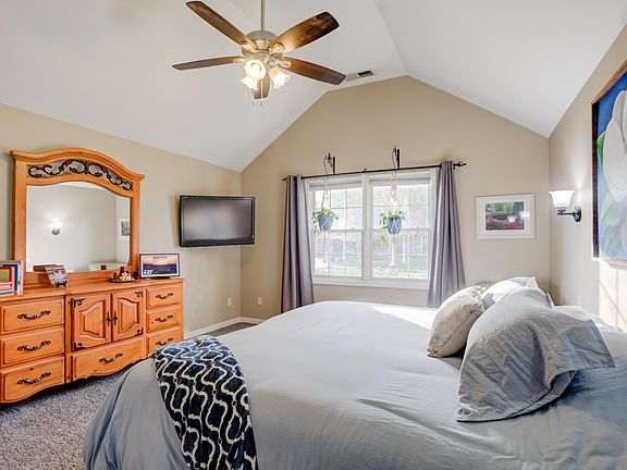 Discover this well crafted, low-maintenance home featuring a split bedroom floor plan and open concept design. The owner's suite boasts soaring cathedral ceilings, two spacious closets (including a walk-in), and a remodeled full bath with a custom tiled walk-in shower and large vanity. Step into the inviting living room, highlighted by a cozy gas log fireplace and quality built-ins. The eat-in kitchen is complete with a breakfast bar, dedicated pantry, and updated black stainless steel appliances. Two additional spacious bedrooms offer generously sized closets, while the second full bath includes a double sink vanity and shower/tub combo. A convenient mudroom is located just off the garage, and the sale includes the washer and dryer! Enjoy outdoor living on your new patio, shaded by a gazebo with a Bluetooth controlled fan. An additional deck overlooks the fully fenced yard, complete with a built-in cantilever umbrella for those sunny days. Additional features include upgraded insulated garage doors with a MyQ opener in the 2.5 car garage, and a new air conditioner installed in 2022. This home is ready for you to move right in and start living!