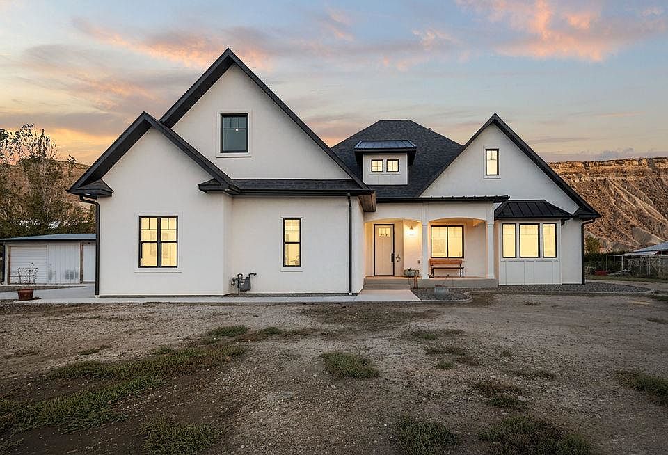 Built in 2023, this exquisite 4-bedroom, 4-bathroom home offers 2,534 sq ft of refined living space on over 3 acres with commanding views of Mt. Garfield. Designed for both comfort and sophistication, the open floor plan features expansive windows and a gourmet kitchen with premium finishes and a walk-in pantry. The primary suite provides a serene retreat with a spa-inspired bath and generous closet space. A detached garage and well-equipped shop offer ample room for projects, equipment, or storage, while the producing orchard—home to approximately 800 O'Henry late-harvest peach trees—adds both charm and functionality to the property. Enjoy modern luxury with a touch of country elegance—where stunning design meets the freedom of wide-open space.