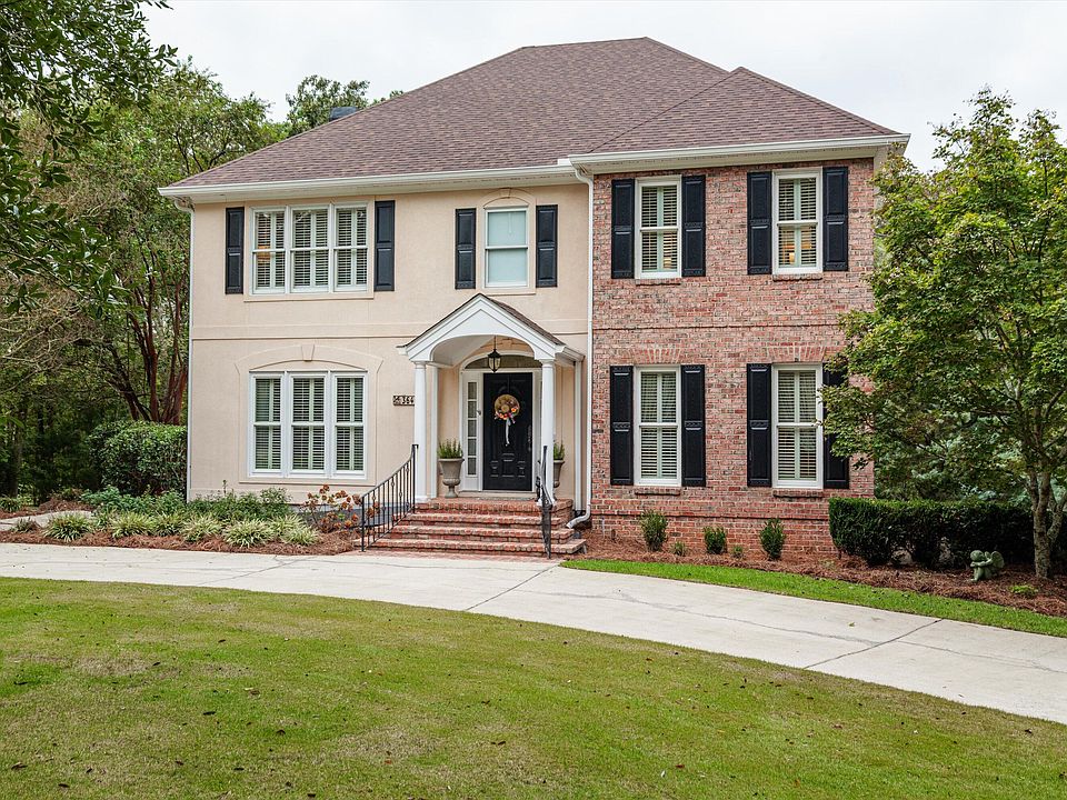 Nestled on 2.88 serene acres along a private road with the picturesque part of the Savannah River, this charming home blends classic elegance with modern comfort. Inside, you'll find hardwood floors, detailed moldings, granite countertops, and plantation shutters. The welcoming foyer opens to a formal living room/study and a formal dining room, setting the tone for elegance. A spacious family room showcases an ornamental fireplace framed by custom built-ins and flows seamlessly to a screened porch for year-round enjoyment. The chef's kitchen is a true highlight, featuring floor-to-ceiling cabinetry, a center island, farm sink, walk-in pantry, built-in espresso maker, and premium Monogram appliances—including a 6-burner gas range, oven, and microwave. Upstairs, the luxurious primary suite offers a cozy fireplace, keeping room, private balcony, walk-in closet with custom built-ins, clawfoot tub, and walk-in shower. Two additional bedrooms share a Jack & Jill bath with separate vanities. The lower level includes a versatile recreation room, walk-in wine closet, private bedroom suite with built-in desk and patio access, large laundry room, and a spacious two-car garage with extra storage. Outdoors, the property boasts a greenhouse with power and water, and a detached workshop. Conveniently located to the Medical District and top rated Columbia County Schools. Ideal tournament rental!