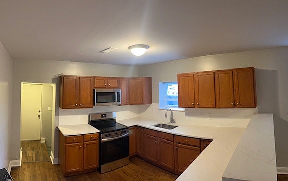 This spacious and newly renovated 3-bedroom, 1-bath home combines comfort and convenience, ideally situated near public transportation for quick city access. Featuring attractive hardwood floors throughout, the bright open-plan living area flows into a modern kitchen complete with stainless steel appliances, ample cabinet space, and sleek countertops.