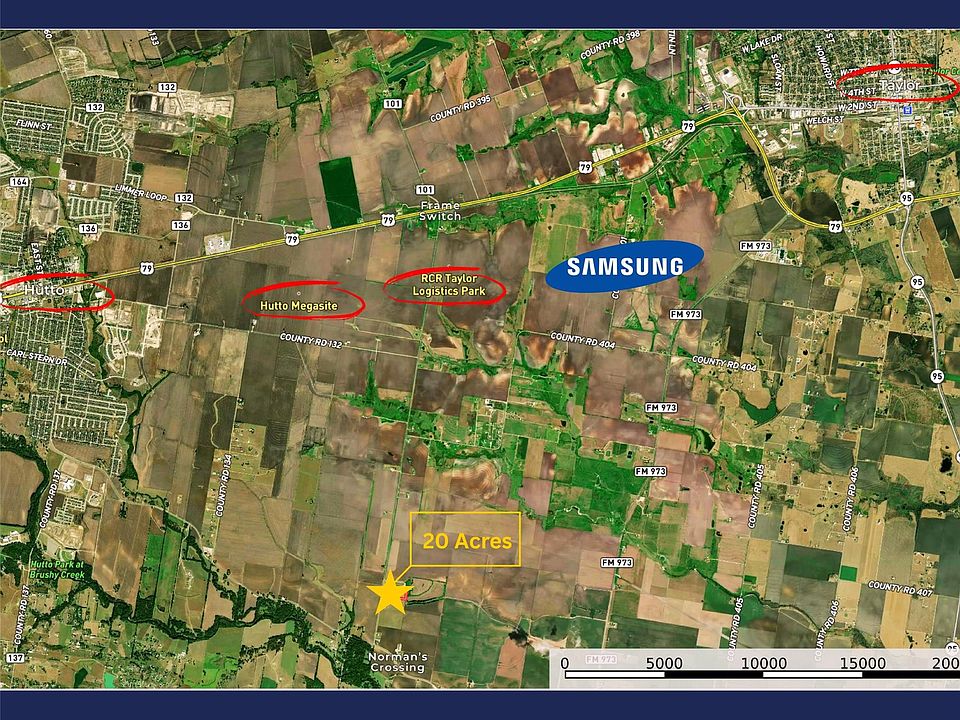 Exceptional 20.62-acre unrestricted parcel, perfectly positioned nearly equidistant from Hutto and Taylor, only 5 miles from Samsung’s Semiconductor Plant. Located 6 miles south of RCR Logistics Park (and on the same road) and 4 miles south of Hutto Megasite, this level lot offers excellent access to HWY 79, FM 973, and the 130/95 toll road interchange. Ideal for commercial, industrial, and residential development in the thriving Hutto ISD. A prime opportunity!