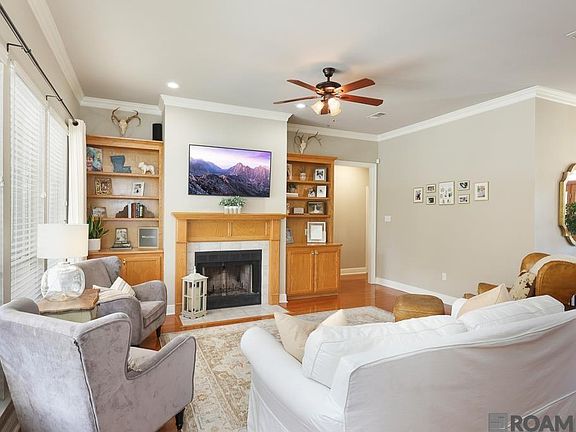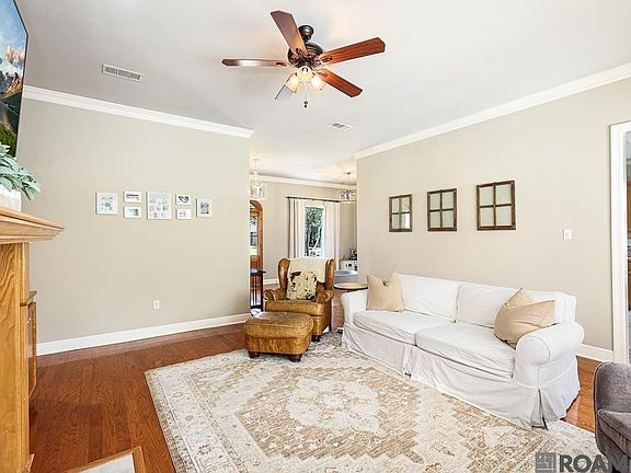 NEW ROOF 2025! This immaculate home in Prairieville, right on the Baton Rouge line, is located in the highly desirable Manchac Crossing neighborhood. Walking up to this home, you are welcomed by a charming front porch, fresh paint, and stately columns. Inside, the spacious kitchen features an island, a corner sink with windows, and it opens to a breakfast area featuring a large vaulted ceiling and an arched window, creating a bright and inviting space. The living room is cozy, with a fireplace surrounded by built-ins and a wall of windows overlooking the back patio and yard. Adjacent to the kitchen, the formal dining room, currently used as a bonus space for kids, flows seamlessly into the living area, making the space versatile for any need. The primary bedroom offers a tray ceiling and an ensuite bathroom that includes double vanities, walk-in closets, a large soaker tub, and a separate shower. Outdoors, enjoy the beauty of a gorgeous live oak tree, a covered patio, two exterior storage areas, and ample parking. The fully fenced yard features a driveway gate for added privacy. Living in Manchac Crossing offers easy access to the interstate, Airline Highway, and nearby dining and shopping options. Best of all, this home has never flooded and does not require flood insurance, offering peace of mind.