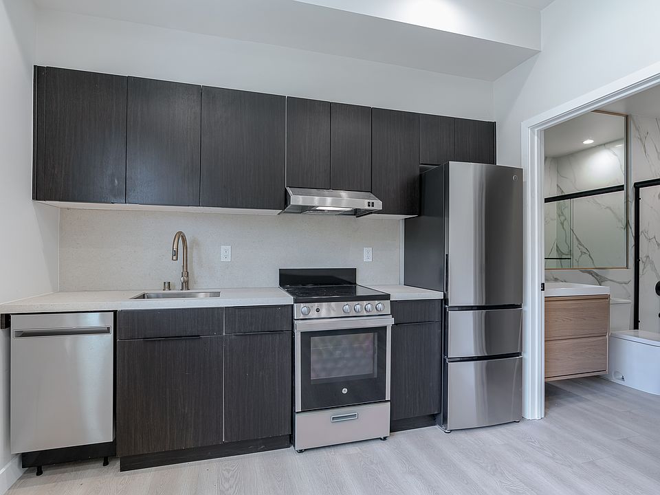 Remodeled studio apartmentStainless steel appliance packageRecessed lightingBrand-new vinyl flooringIn-unit washer and dryer