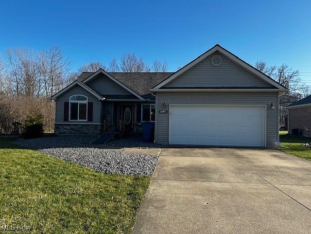 This charming ranch-style home, nestled on a wooded 0.77-acre lot, offers a blend of modern amenities and a convenient location. With three bedrooms and two full bathrooms, the split bedroom layout features the primary bedroom and bath on one side of the home, while the two additional bedrooms and a bath are located on the other side, offering privacy and functionality. The primary bedroom features an en-suite bath with a Whirlpool tub, a separate shower, and a single vanity. The kitchen is equipped with stainless steel Kenmore appliances, including a dishwasher, a side-by-side refrigerator, an above-range microwave, and a glass-top electric range, all of which will remain. The living room boasts a corner gas fireplace with a raised hearth and stone front, creating a cozy atmosphere. The fully finished basement doubles your living space. Additional features of this home include a new roof (complete tear-off) installed in June 2022, new soffits and ice guard, Pella vinyl replacement windows (installed in 2019), a Reem 85-gallon hot water tank (installed in 2014), a new air conditioner (installed in 2016), and a sump pump (installed in 2024). The home also has a newer electric panel. The first-floor laundry room features a utility sink, and additional storage leads to the garage, which has pull-down steps leading to a floored attic space. The washer and dryer are negotiable. Custom blinds throughout add convenience and style. Outdoor amenities include a 33-foot round and 54-inch tall aluminum pool, along with two basketball hoops (cemented in place). The electric dog fence with a collar will remain. The home is conveniently located near I-90 and 480. This home offers a blend of modern amenities and a convenient location and is ready for the next buyer to put their own touches on.