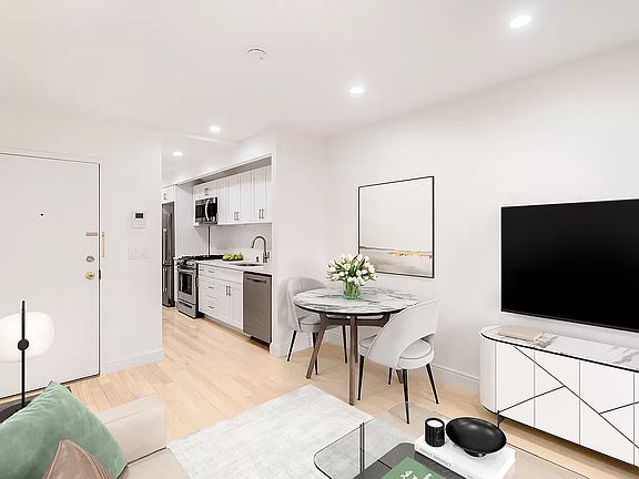 Step into a bright and open living room, where recessed lighting and a clean, contemporary design create a welcoming atmosphere. The layout flows seamlessly into a renovated galley kitchen, which has been beautifully appointed with: