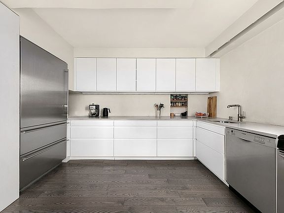 Minimalism and simplicity define the kitchen's design, featuring custom cabinetry, marble countertops, strategically placed recessed lighting, top-of-the-line appliances including a Liebherr fridge, and corner exposure with city views, perfect for every gathering.