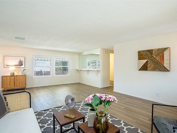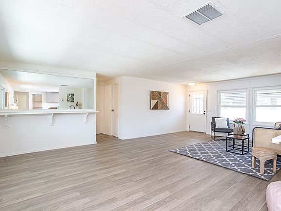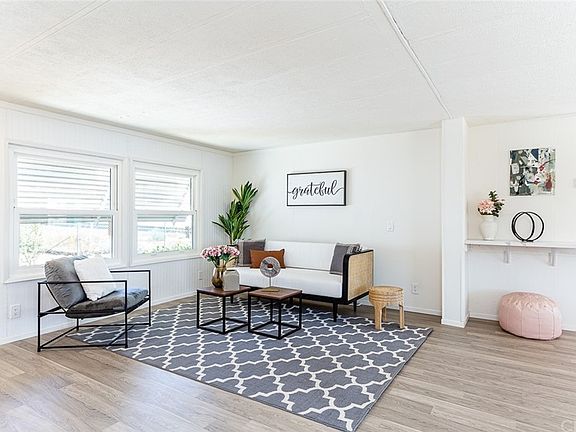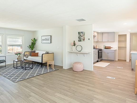 Located at the end of a private cul-de-sac, this newly renovated manufactured home plus separate "barndominium" all situated on a spacious 10,000+ sf lot, and you own the land The main home is three bedroom, two bath, stylishly finished with modern farmhouse gray kitchen cabinetry, sleek quartz countertops, brand new GE gas range, generous pantry storage, convenient casual dining counter, plus plentiful additional counter space ideal for coffee bar or serving family and friends. Formal living and dining area opens to the kitchen area and expands to the three separate sleeping quarters. Primary suite boasts a walk-in closet, en-suite bath with sumptuous soaking tub and separate shower. Luxury vinyl plank flooring newer light fixtures, many newer windows and freshly painted throughout gives a clean fresh feeling. As a real BONUS ... just steps away is the charming detached "barn-style" structure, with unlimited potential to create a separate living space. Currently boasting over 900 sf of two story functional livable space, ideal for workshop, art studio, and with an addition of kitchen amenities, could function as a completely separate home, ideal for multi-family needs, or rental income. Two separate concrete driveways provide plentiful parking, along with a fully covered carport. The grounds have been freshly landscaped, and the property is fully fenced. This is a rare opportunity to own an updated property with income potential.