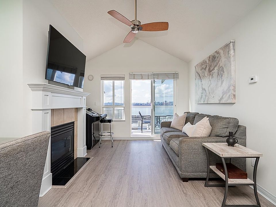 Top floor, 1 bed, 1 bath, OCEAN VIEW unit in sought-after Lower Lonsdale, close to breweries, walking trails, shops and restaurants. This light-filled home features vaulted ceilings in the living room, anchored by a cozy gas fireplace (included in strata) and sliding doors that lead to your own private patio with panoramic ocean and city views. Enjoy the same beautiful scenery from the primary bedroom, which leads to a walk-in closet. With updated laminate flooring throughout, in-suite laundry, parking and storage, this penthouse-style home in a quiet, prime location has it all.