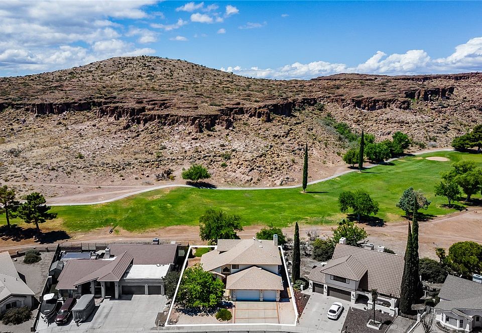 This 3285 livable sq. ft home backs up to the sceni 3rd hole of Cerbat Cliffs Golf Course. With 4 bedrooms and 3 bathrooms on nearly 1/4 acre, this property has epic views of the rocky outcroppings and cliffs that surround the golf course. The backyard has a large covered patio perfect for relaxing or watching nature and passing golfers. Mature trees have grown around the yard adding additional shade and privacy. This home was very well taken care of and has had just one owner since being built. A newer roof has been added and the spacious master bedroom has one of the most largest walk-in closets you will find anywhere. This home features original real wood floors, and an open kitchen to living room with easy access to the patio. There is a separate living room and private dining room on the lower floor. The generous kitchen space and features a breakfast bar that opens to the living room, overlooking the fireplace. With two guest rooms upstairs, and a shared a jack and jill bathroom. The owner uses Star Link for internet that is still in the home and can be transferred to a new owner but other forms of internet are an option. The location of this home is within minutes from shopping, restaurants, banks and other important community amenities including being just a couple minutes from the golf clubhouse and golf practice facilities for avid golfers.