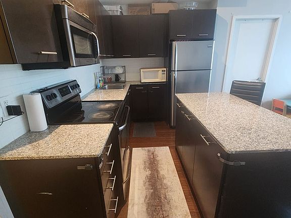 Bamboo floorComposite quartz countertopCentral islandLots of cupboards
