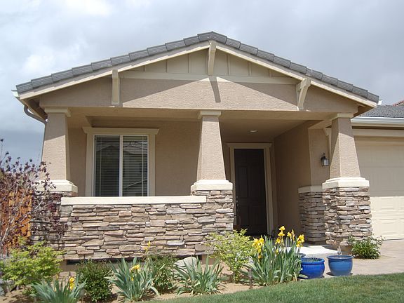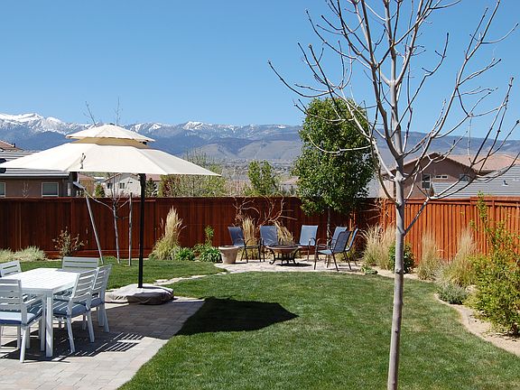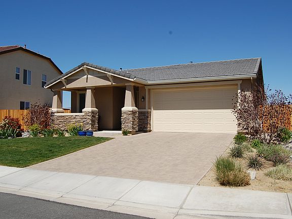 Single level living in beautiful Damonte Ranch! This three-bedroom home includes 2 full baths, a den, laundry room, linen closet, coat closet and walk-in master closet. There is a paver driveway, stone front, extended porch and fully finished two car garage with attic access. Entertain guests while you're cooking in a kitchen that's open to the great room. The kitchen features Cherry cabinets with brushed nickel handles, Corian counter tops with under mount stainless steel sink, built-in microwave over a gas range and all stainless steel appliances. Home features built in cabinets in the great room with adjustable shelves and a "no slam" drawer, perfect for movies, games and remotes. There are 9 foot ceilings throughout the home with archways. Windows are framed with molding and include custom blinds. This home has upgraded lighting, flooring and 5 ceiling fans throughout. There is tile flooring and crown molding in laundry room. Both baths have tile flooring. There is laminate throughout the rest of the house, and all flooring has 5 1/4” baseboards. Large back yard with mountain views. Fully fenced with dog area, large paver patio off great room with paver walkway and a second flagstone patio with path. Willing to sell and then rent the house from the buyer for up to 1 year.