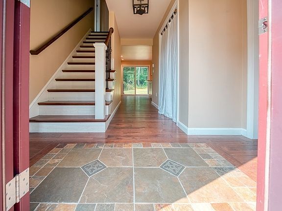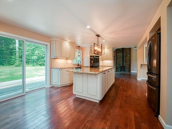 Located on 2.5 acres, this beautiful home offers 3 bedrooms (4 bedroom septic system) & hickory flooring throughout. Kitchen was custom designed with KraftMaid Torrington cabinets - biscotti with cocoa glaze. It includes a full wall of pantry closets, double ovens, island with Whirlpool electric cooktop. Dining room features a wine/coffee bar area and desk area with lighted glass cabinets & under counter lighting. Family room has a vaulted ceiling & wood stove with natural river stone wall. Recent French doors lead todeck overlooking private back yard. First floor also includes a laundry room and half bath. Mudroom entrance has distinctive natural slate floors, double closet and pantry closet. Freench doors lead to 27 X 29 great room addition with cathedral ceiling, 2 ceiling fans and stained glass pendants and mini split. Main bedroom includes walk in closet and full master bath. 2 car garage under and large unfinished basement with workshop. Showings start at open house Sat. 10-12PM