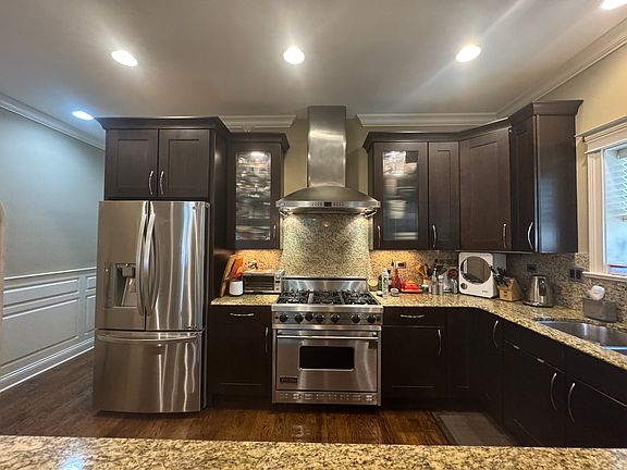 Chef's kitchen with stainless steel appliances, granite countertops, vented hood and breakfast bar