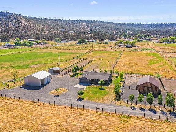 Exceptional horse property on 9.8 acres with 8 acres of irrigation. This home has lots of updates including new heat pump, kitchen cabinets & quartz counter tops, vinyl laminate flooring and trim, lighting, blinds, vaulted ceiling & an open split floor plan & a large fenced yard. Outside you will find a host of equestrian amenities including a barn & arena, stud barn with two runs, a chicken barn, multiple cross-fencing options. The flood irrigation is well set up for ease of watering & multiple frost frees throughout the property. The shop has a full concrete floor in the 2 bays with power, 3rd bay is gravel for RV parking or hay storage. This remarkable estate comprises two tax lots, each equipped with its own well and power supply, allowing for potential subdivision if desired. Property is near the Crooked River Wetlands Complex. Irrigation is $72.00 a year so very inexpensive to irrigate.
