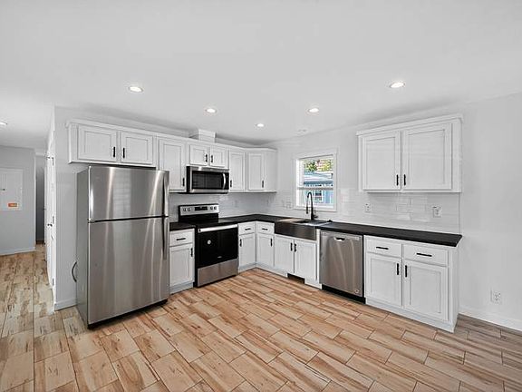 Contemporary stainless farmhouse sinkStainless steel appliancesTiled backsplashQuartz countertopsMain floor laundry areaPrivate bathroomLarge walk-in closet