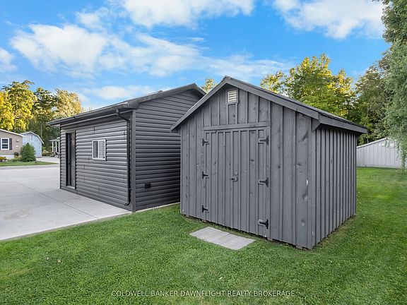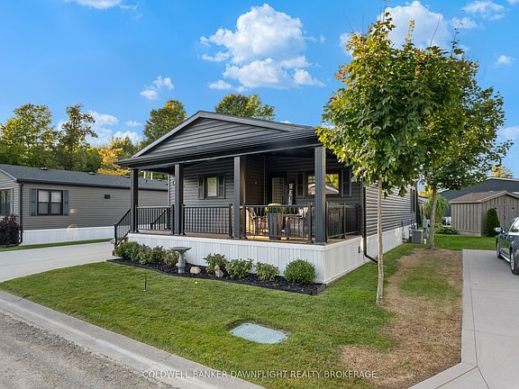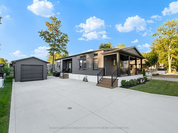 Welcome to Birchbark Estates, where this beautifully maintained Northlander home, built in 2019, offers 1,012 sq. ft. of comfortable living just minutes from Grand Bend and the shores of Lake Huron. The open-concept main floor features a bright white kitchen with quartz countertops, a spacious island with seating for four, and a welcoming living room complete with an electric fireplace and shiplap surround. The home includes two bedrooms, highlighted by a primary suite with a walk-in closet with built-ins, a second electric fireplace with matching shiplap detail, and a private 4-piece ensuite with a walk-in shower and double vanity. A second full bath and a well-appointed laundry room with built-ins add convenience. Outdoor living is enhanced by a large covered front porch, perfect for entertaining, along with a 10x10 garden shed and an insulated 12x18 garage. Residents enjoy a monthly fee of $445, which covers road maintenance, snow removal, garbage, water, and sewer. An additional parking area is available for trailers, campers, and boats. The community also offers optional access to an indoor pool and fitness facility. Additional features include a forced-air gas furnace, central air, and even the option to drive battery-powered golf carts throughout the neighbourhood.
