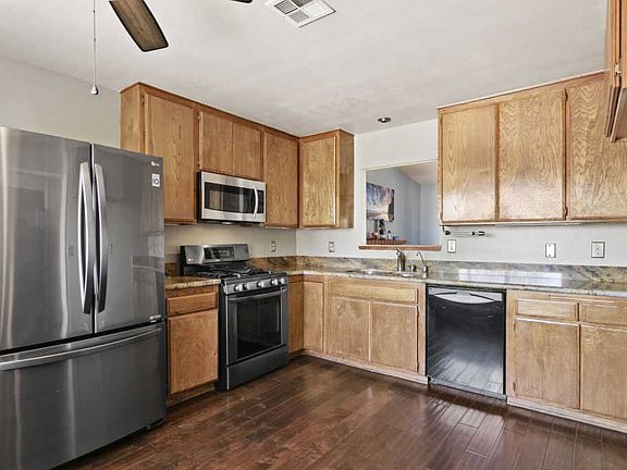 Welcome to this private abode. Eloquently located in a quiet area off of Barrel Springs. Welcomed with custom hardscaping and walkways adorn the front entry way. Enter into bliss as light glorifies hardwood floors, glistening across brilliant upgraded baseboards & onto subtle earth toned walls. Find pathways perfectly cased with custom trim. Find a magnificent kitchen lined with oak look cabinets, glorious granite counters, stainless steel appliances & sink, a nickel plated faucet & a cooling ceiling fan. Relax in a Livingroom suited for comfort with warmth radiating from a brick fireplace. Enjoy the view through a double door entry with large windows presenting a gorgeous backyard. Further find 3 perfectly sized bedrooms with a massive master bedroom featuring a private bathroom. Bath bathrooms are upgraded with tile backsplashes, upgraded tubs, showers and fixtures. The backyard is enormous with space for pool & entertaining.